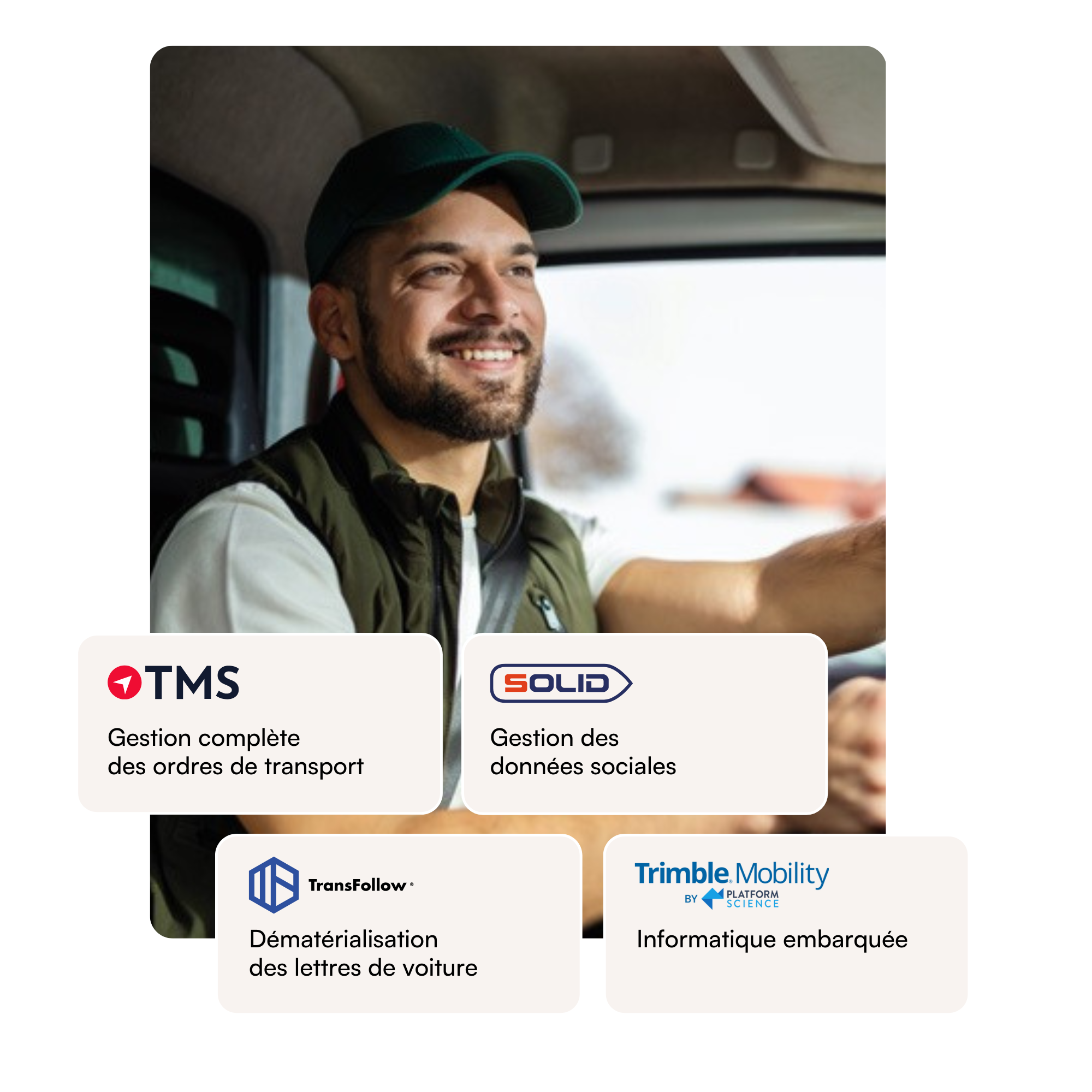 - Solutions embarquées Trimble : interconnexion avec le TMS pour assurer le lien entre le bureau et la route, transmission des missions, remontée des temps de conduite, géolocalisation des véhicules, validation des livraisons, suivi des consommations.